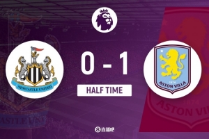 傷停補(bǔ)時(shí)4分鐘。上半場比賽結(jié)束,紐卡斯?fàn)柭?lián)0-1阿斯頓維拉。
