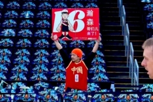 某球迷穿著中國男籃的球衣并高舉牌子,上面寫著:“瀚森,哥們來了!”