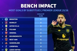 本賽季英超替補(bǔ)球員進(jìn)球數(shù)量排名: