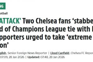 體育資訊01月28日訊 切爾西客戰(zhàn)那不勒斯的歐冠關(guān)鍵戰(zhàn)賽前,切爾西發(fā)表聲明,稱(chēng)2名切爾西球迷在那不勒斯受傷。據(jù)太陽(yáng)報(bào)報(bào)道,兩名切爾西球迷被那不勒斯極端球迷追趕后刺傷。