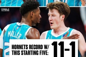 據(jù)統(tǒng)計,黃蜂使用拉梅洛·鮑爾、布蘭登·米勒、克尼佩爾、布里奇斯、迪亞巴特這套首發(fā)的戰(zhàn)績?yōu)轶@人的11勝1負。