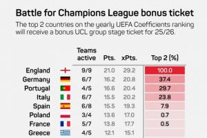 新賽制歐冠中,歐戰(zhàn)積分排名前二的聯(lián)賽可額外獲得一個(gè)歐冠名額。
