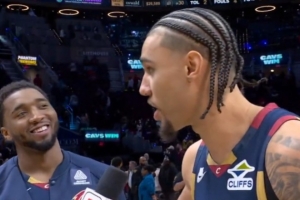 體育資訊1月31日訊 在昨天騎士主場(chǎng)129-99大勝湖人的賽后,在場(chǎng)邊采訪環(huán)節(jié),泰森打斷記者對(duì)米切爾的采訪關(guān)于詹姆斯的提問,并表示這里現(xiàn)在這里是米切爾的城市。