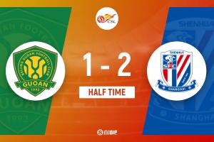 上半場傷停補(bǔ)時(shí)6分鐘,半場結(jié)束,北京國安暫1-2上海申花。