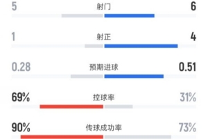 切爾西3-2西漢姆聯(lián)全場數(shù)據(jù):射門14-11,射正6-6,控球率71%-29%