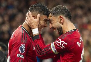 此役,33歲的老將卡塞米羅傳射建功,當(dāng)選全場(chǎng)最佳;B費(fèi)同樣表現(xiàn)搶眼,送出兩次關(guān)鍵助攻,并在補(bǔ)時(shí)第94分鐘助攻舍什科完成絕殺,助球隊(duì)鎖定勝局。