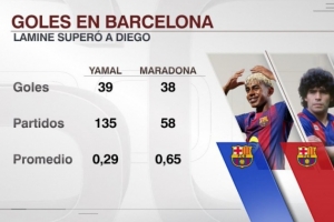 據(jù)ESPN統(tǒng)計(jì),18歲亞馬爾已經(jīng)為巴薩打進(jìn)39球,巴薩生涯進(jìn)球數(shù)量超越馬拉多納(38球)。