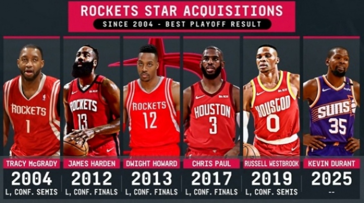 體育資訊07月20日訊 官方轉(zhuǎn)播曬出了火箭21世紀(jì)以來球隊(duì)做的球星交易以及他們帶領(lǐng)球隊(duì)在季后賽達(dá)到的最好成績: