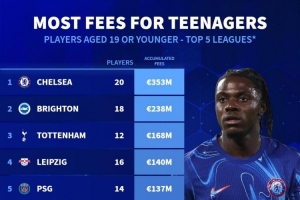 體育資訊7月20日訊 德國轉(zhuǎn)會市場統(tǒng)計了21-22賽季以來五大聯(lián)賽俱樂部引進U19(包含19歲)球員的總費用,并列出榜單,切爾西居首,布萊頓、熱刺二三位。