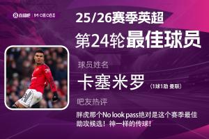 2025-2026賽季英超火熱進(jìn)行中,體育資訊和咪咕體育聯(lián)合發(fā)起每輪英超最佳球員評選活動(dòng)!第24輪評選結(jié)果已經(jīng)出爐,曼聯(lián)中場卡塞米羅當(dāng)選!這也是舍什科、B費(fèi)、庫尼亞之后,曼聯(lián)球員連續(xù)4輪蟬聯(lián)本獎(jiǎng)項(xiàng)。