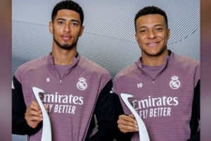 體育資訊2月5日訊 貝林厄姆今天更新Instagram,曬出自己與姆巴佩和FIFPRO最佳陣容獎(jiǎng)杯的合影。