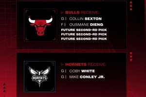 這筆交易中,公牛送出科比·懷特和康利,換來黃蜂的塞克斯頓、烏斯曼·吉昂和3個(gè)次輪簽(一個(gè)29年,兩個(gè)31年)。