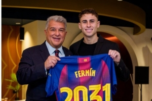 體育資訊2月6日訊 費(fèi)爾明正式與巴薩簽字續(xù)約,巴薩官推曬出費(fèi)爾明與球隊(duì)主席拉波爾塔合照,并獲贈(zèng)印有2031號(hào)碼的紀(jì)念球衣。