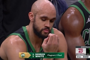 GIF-懷特?fù)浞栗U威爾三分犯規(guī),裁判回看升級一級惡意,解說說這是懷特生涯第一個惡意犯規(guī)
