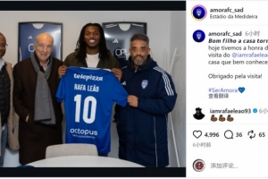 葡萄牙邊鋒萊奧造訪兒時(shí)母隊(duì)阿莫拉,并獲贈(zèng)阿莫拉10號(hào)球衣,俱樂部官方社媒曬出照片,配文:“好孩子總會(huì)回家,今天我們有幸接待了萊奧,他對(duì)這里再熟悉不過了,感謝你的來訪!”