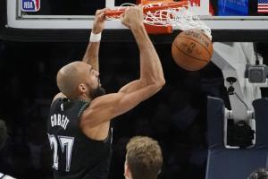 此役,戈貝爾出戰(zhàn)33分鐘,投籃12中5,罰球4中2,得到12分16籃板2助攻3搶斷2蓋帽,包括7進(jìn)攻板。