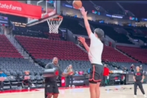 體育資訊2月8日訊 今日上午開拓者主場(chǎng)背靠背再戰(zhàn)灰熊,賽前楊瀚森和助教練習(xí)了對(duì)抗下的勾手,此外小楊還在三分線外變向過人單打了助教一個(gè),氣氛比較輕松。