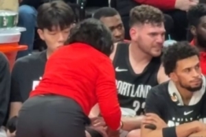 克林根首節(jié)兩手均受傷,隊醫(yī)處理時楊瀚森坐在旁邊