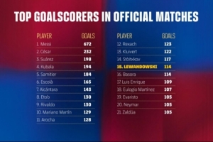 截至目前,在巴薩效力了三個(gè)半賽季的萊萬共計(jì)為球隊(duì)打進(jìn)了114粒正式比賽進(jìn)球,在俱樂部歷史射手榜上追平了巴索拉,并列第15位。