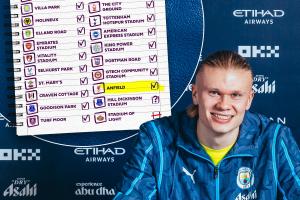 哈蘭德首次在安菲爾德進球,英超出戰(zhàn)過的24個球場,他已攻破23個球場大門,只剩埃弗頓新球場——希爾·迪金森球場還未進球。