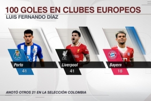 數(shù)據(jù)統(tǒng)計(jì)顯示,路易斯·迪亞斯在旅歐期間俱樂(lè)部賽事已經(jīng)打進(jìn)了100粒進(jìn)球,其中波爾圖41球,利物浦41球,拜仁18球。