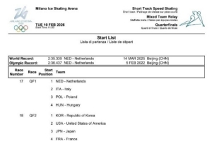 米蘭冬奧會(huì)短道速滑混合接力1/4決賽分組:中國與加拿大同第三組
