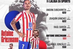 此役過后,格列茲曼已經(jīng)在西甲出戰(zhàn)551場比賽(204球97助),成為西甲歷史出場第四多的球員。