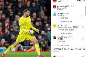 曼城門將多納魯馬補(bǔ)時(shí)階段做出關(guān)鍵撲救,幫助球隊(duì)取勝,賽后他在社交媒體上曬出慶祝勝利的照片,配文:“太棒了!”