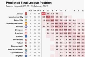 體育資訊02月09日訊 英超第25輪結(jié)束,阿森納6分領(lǐng)跑積分榜,曼城、維拉分列二三。opta也更新了英超奪冠概率,其中阿森納高達(dá)90.1%,曼城8.2%,維拉1.6%,切爾西0.1%,利物浦和曼聯(lián)則是0%。