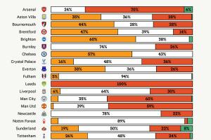 兩家曼徹斯特俱樂部則呈現出相似的支出特征,將大約60%的轉會費用于25至28歲的球員。