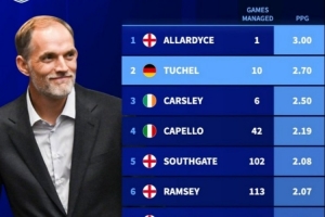 體育資訊2月12日訊 圖赫爾正式與英格蘭隊續(xù)約至2028年,德轉也盤點了英格蘭隊史場均積分最高主帥榜單,具體如下: