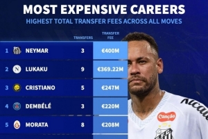 體育資訊7月22日訊 德國轉(zhuǎn)會市場統(tǒng)計了球員生涯總轉(zhuǎn)會費,并列出榜單,內(nèi)馬爾居首,盧卡庫、C羅排名二三位。