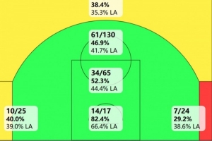 美媒曬出了保羅上賽季的投籃熱圖,他上賽季在三分線內(nèi)的各個區(qū)域命中率都高于聯(lián)盟平均水平,82場比賽籃下僅出手17次,但命中率14個,命中率高達82.4%,遠高于聯(lián)盟平均的66.4%。