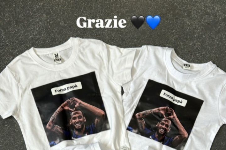 恰爾汗奧盧的第三個(gè)孩子于2023年出生,照片上的三件小碼T恤對(duì)應(yīng)著恰爾汗奧盧的三個(gè)孩子,同時(shí)T恤上用意大利語(yǔ)寫(xiě)著“爸爸加油”,配圖是恰爾汗奧盧身穿國(guó)米球衣時(shí)手比愛(ài)心。