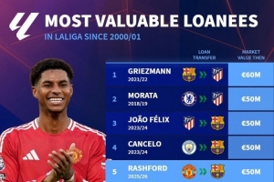 體育資訊7月24日訊 德國轉(zhuǎn)會市場統(tǒng)計了本世紀(jì)以來租借加盟西甲俱樂部球員的身價,并列出榜單,格列茲曼6000萬歐居首,拉什福德5000萬歐排名并列第2位。