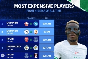 體育資訊7月31日訊 奧斯梅恩轉(zhuǎn)會加拉塔薩雷只待官宣,《轉(zhuǎn)會市場》也統(tǒng)計了尼日利亞球員歷史轉(zhuǎn)會費榜單,奧斯梅恩獨占前二。
