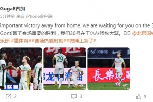 賽后,古加在社媒曬照并寫道:“贏了客場(chǎng)重要的勝利,我們30號(hào)在工體恭候您大駕。????”