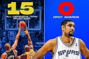 然而,在鄧肯整個職業(yè)生涯中,他從來沒有獲得過最佳防守球員獎,他在最佳防守球員的評選中最多排在第三。
