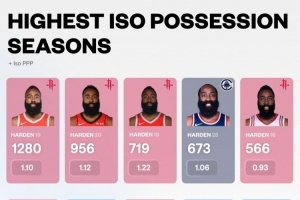 24-25賽季,哈登單打673次