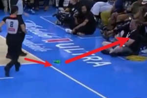 比賽期間,有球迷再次往場內扔了一個綠色的假陽具,裁判當即中斷比賽,女裁判伸腳將假陽具一腳踢飛。