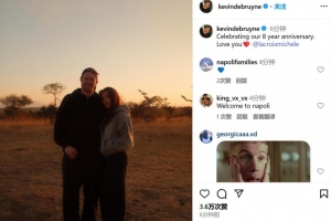 德布勞內(nèi)寫道:“慶祝我們結(jié)婚8周年,愛你?? @lacroixmichele(注:此為德布勞內(nèi)妻子的賬號)!”