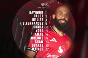曼聯(lián)首發(fā):1-巴因迪爾、2-達洛特、4-德里赫特、23-盧克-肖、15-約羅、25-烏加特、8-B費、10-庫尼亞、37-梅努、16-阿瑪?shù)隆?9-姆貝莫
