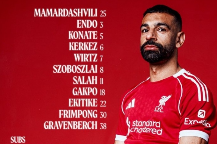 利物浦首發(fā):25--瑪瑪達(dá)什維利、5-科納特、6--科爾克茲、30-弗林蓬、38-赫拉芬貝赫、3-遠(yuǎn)藤航、7-維爾茨、8-索博斯洛伊、18-加克波、11-薩拉赫、22-埃基蒂克