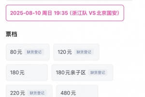 8月4日晚,浙江隊開售本周日主場迎戰(zhàn)北京國安的中超比賽門票,根據(jù)網(wǎng)絡(luò)售票界面顯示,開售半小時后,80元、120元價位的球票以及親子看臺球票均顯示售罄。其中,80元票檔的球票開售僅2分鐘便告售罄!目前,220元票檔也已售罄,只剩下180元和480元兩檔。