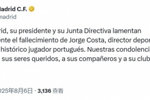 體育資訊8月6日訊 前葡萄牙國(guó)腳、波爾圖體育總監(jiān)若熱-科斯塔離世,皇馬官方發(fā)文哀悼。