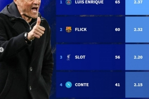 體育資訊8月7日訊 2025年男足最佳教練(克魯伊夫獎(jiǎng))候選人公布,德轉(zhuǎn)也盤(pán)點(diǎn)了5名主帥在24/25賽季帶隊(duì)場(chǎng)均積分榜,具體如下: