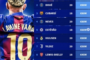 體育資訊8月7日訊 2025年科帕獎10名候選人公布,德轉(zhuǎn)也列出10人身價榜,其中亞馬爾2億歐居首,具體如下: