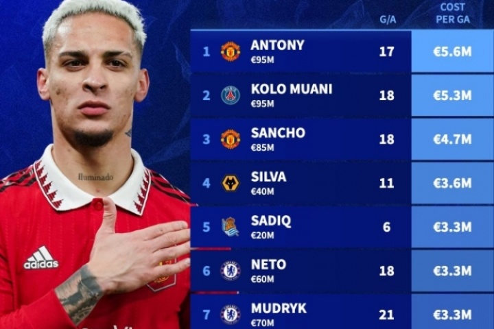 體育資訊08月08日訊 今日德轉(zhuǎn)盤點(diǎn)了參與進(jìn)球花費(fèi)轉(zhuǎn)會(huì)費(fèi)最多的球員,其中安東尼以560萬(wàn)歐每球,位列榜首,前十曼聯(lián)、切爾西各占3席。