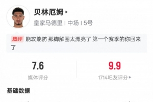 貝林厄姆本場比賽數(shù)據(jù)如下: