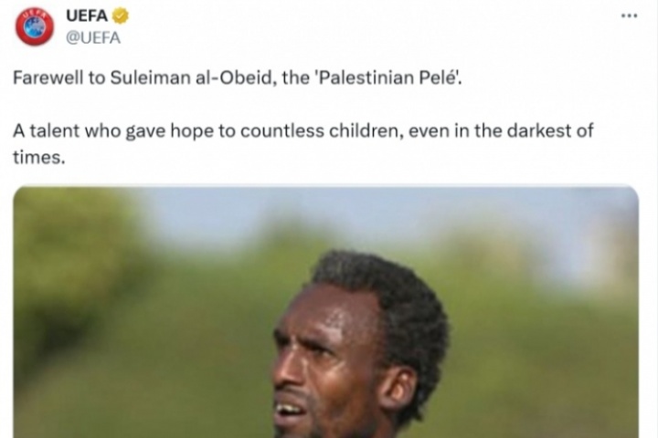 歐足聯(lián)官方寫道:“讓我們告別蘇萊曼-奧貝德,他被稱作‘巴勒斯坦貝利’。即使是在最黑暗的時(shí)刻,他也給無(wú)數(shù)的孩子們帶來(lái)了希望?!?/p>